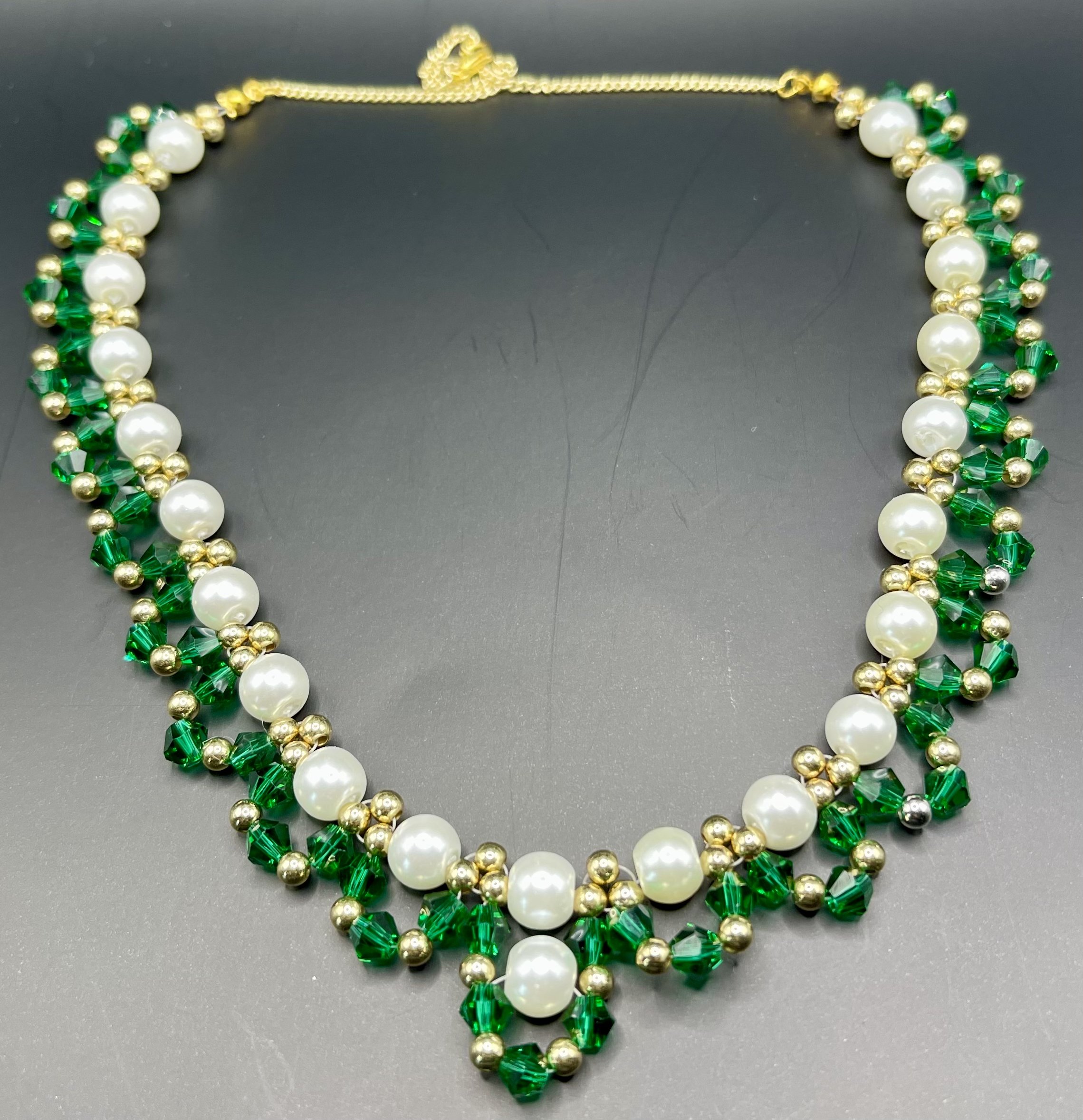 Shop › Beaded Faux Pearl and Emerald Necklace Image 1 of 3 Image 2 of 3 Image 3 of 3 Beaded Faux Pearl and Emerald Necklace $25.00 Add To Cart Added!